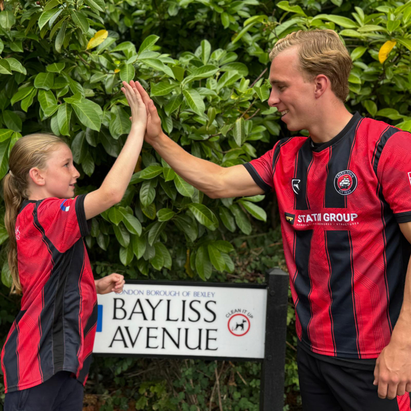 New kit photo with (L to R) youth team player, Lennon, and James Dyer.